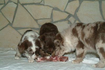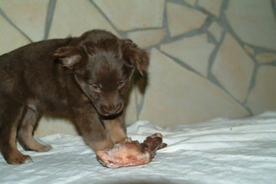 Sobald sie eigenständig ( bei uns nicht vor der 4. Woche) anfangen zu fressen, füttere ich sie in der Hauptsache mit frischem, wertvollen Fleisch. Zunächst nur Tartar, dann Rind, Pferd, Geflügel gewolft, Gemüse, Obst, Kräuter, Quark und natürliche Kauartikel. Ich gewöhne sie nebenbei auch an hochwertiges Trockenfutter. Ich freue mich zwar über jeden Welpenkäufer, der das BARFEN beibehält, würde die Vergabe eines Welpen aber nicht von
